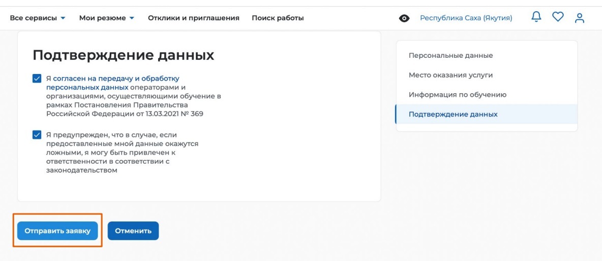 7. Поставьте галочки и нажмите на кнопку "Отправить заявку"
