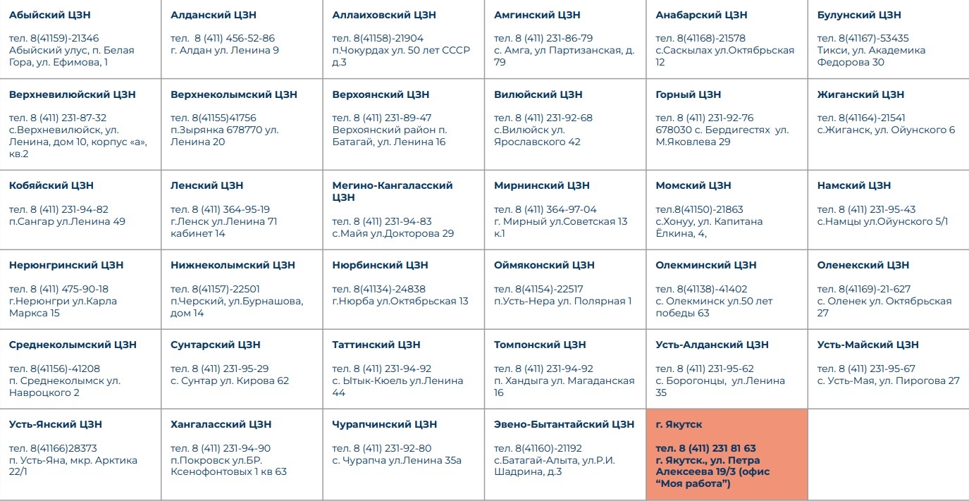 Адреса и контакты Центров занятости населения Республики Саха (Якутия) для предоставления документов