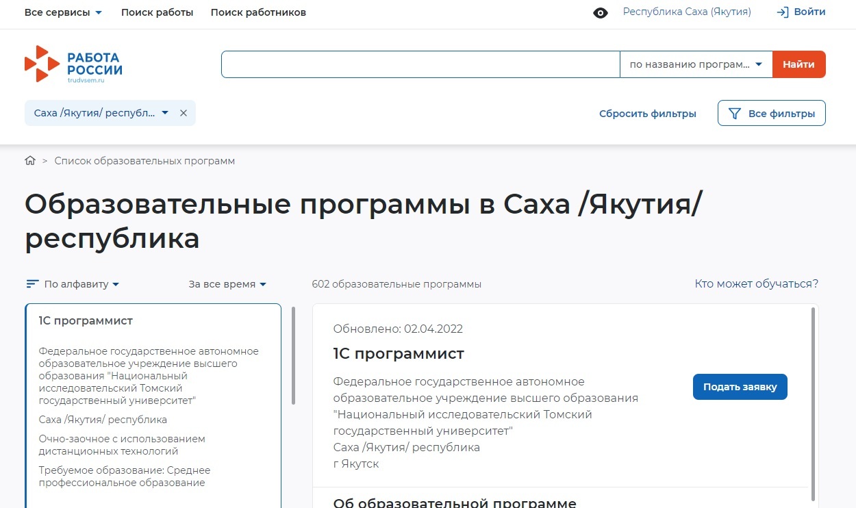 1. Чтобы подать заявку на обучение, необходимо перейти на портал "Работа в России"